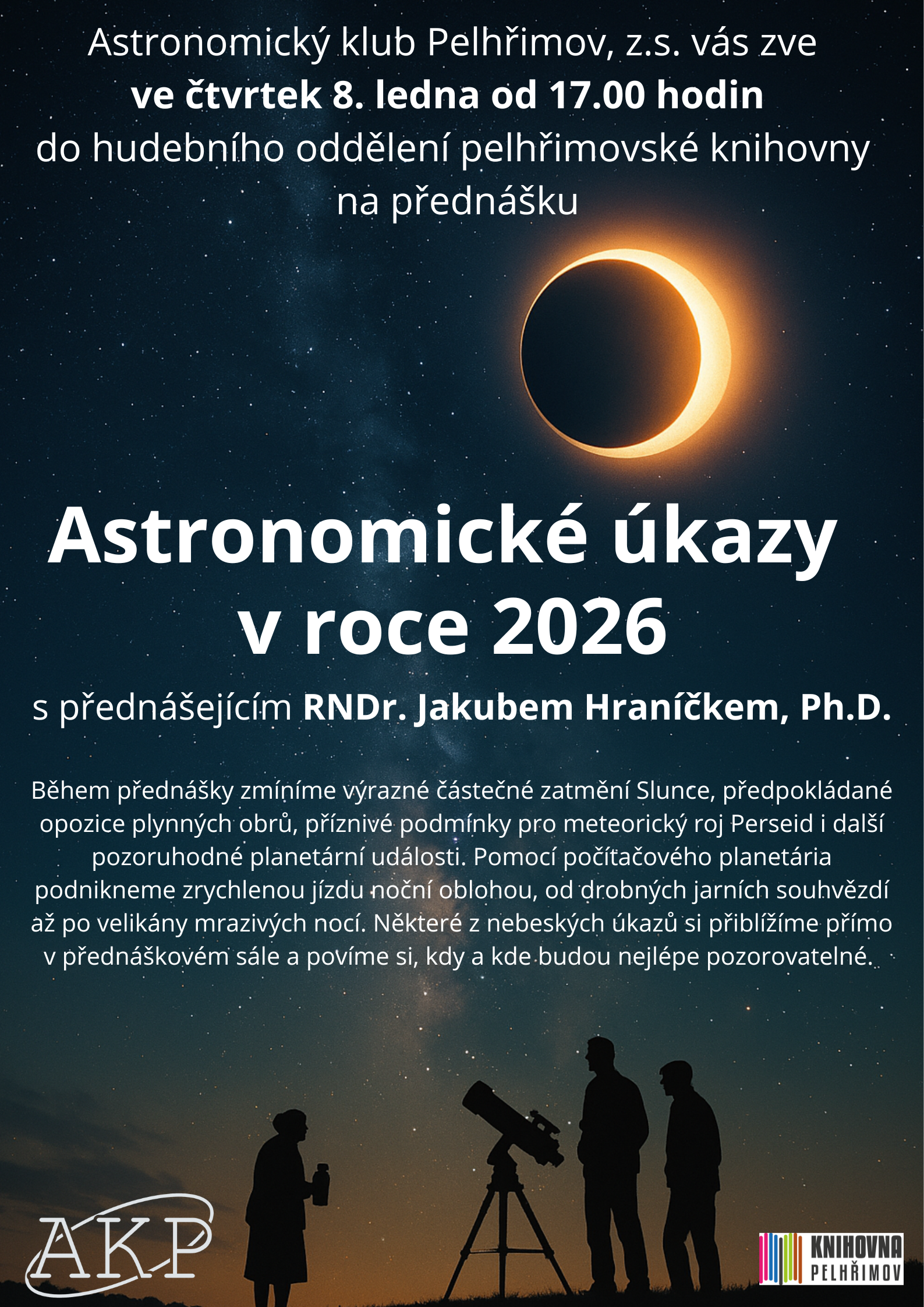 Astronomický klub Pelhřimov, z.s. vás zve ve čtvrtek 8. ledna od 17.00 hodin do hudebního oddělení pelhřimovské knihovny na přednášku Astronomické úkazy v roce 2026 s přednášejícím RNDr. Jakubem Hraníčkem, Ph.D. V roce 2026 nás čeká řada výrazných a dobře viditelných astronomických úkazů – jedinečných příběhů světla a stínu hvězdné oblohy. Během přednášky zmíníme výrazné částečné zatmění Slunce, předpokládané opozice plynných obrů, příznivé podmínky pro meteorický roj Perseid i další pozoruhodné planetární události. Pomocí počítačového planetária podnikneme zrychlenou jízdu noční oblohou, od drobných jarních souhvězdí až po velikány mrazivých nocí. Některé z nebeských úkazů si přiblížíme přímo v přednáškovém sále a povíme si, kdy a kde budou nejlépe pozorovatelné. Tradiční lednová přednáška Astronomického klubu Pelhřimov tak nabídne inspiraci i praktický přehled všem, kteří chtějí rok 2026 strávit s očima často upřenýma k obloze.