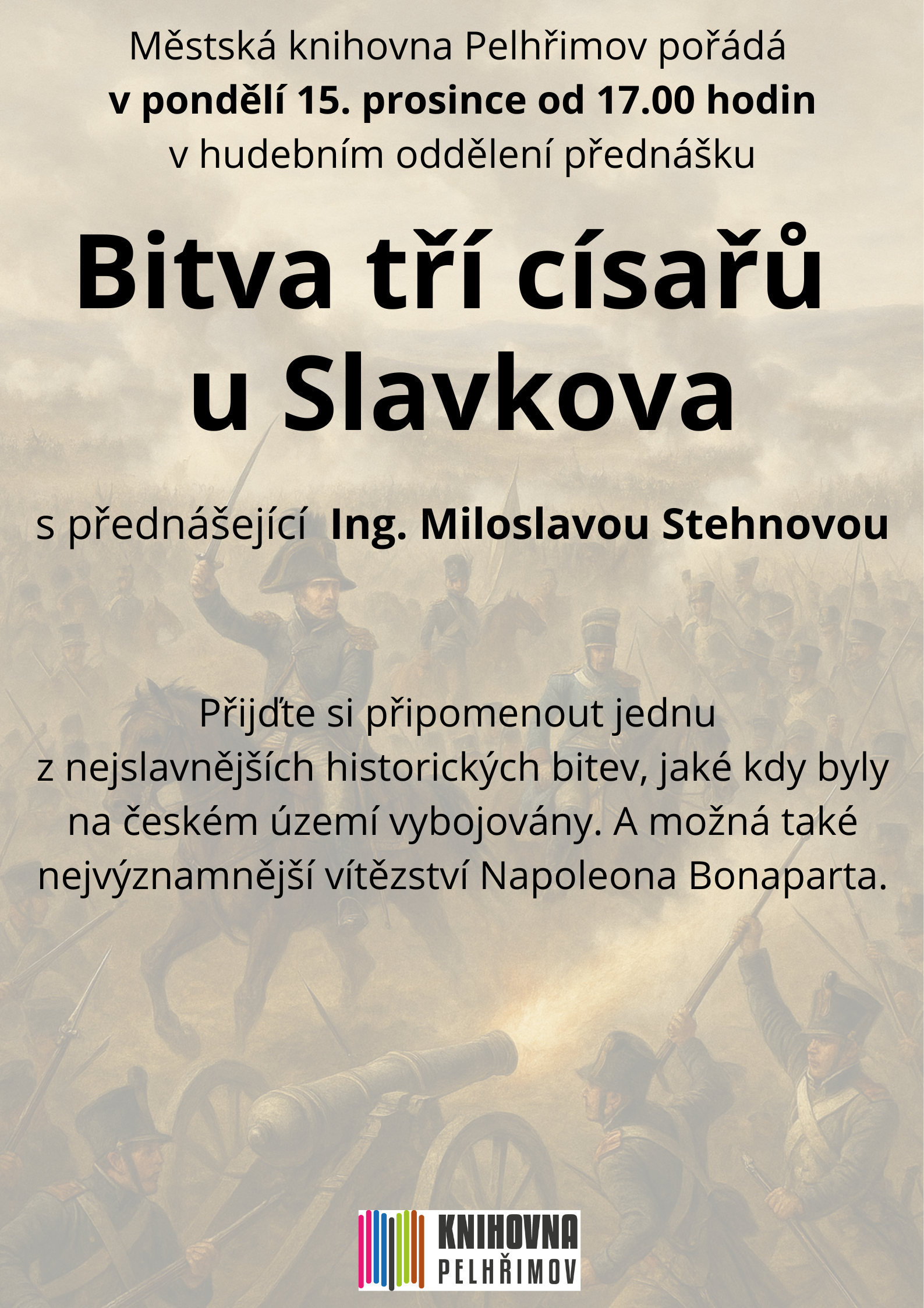 Městská knihovna Pelhřimov pořádá v pondělí 15. prosince od 17.00 hodin v hudebním oddělení přednášku Bitva tří císařů u Slavkova s přednášející Ing. Miloslavou Stehnovou. Přijďte si připomenout jednu z nejslavnějších historických bitev, jaké kdy byly na českém území vybojovány. A možná také nejvýznamnější vítězství Napoleona Bonaparta…
