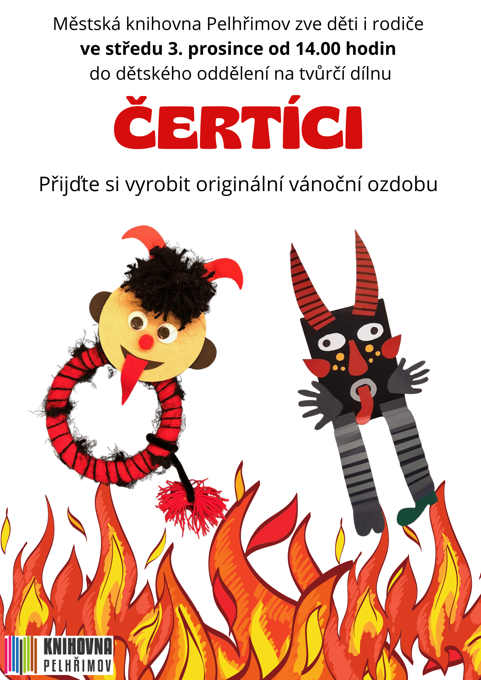 Čertíci 03.12.2025 14:00 Městská knihovna Pelhřimov zve děti i rodiče ve středu 3. prosince od 14.00 hodin do dětského oddělení na tvůrčí dílnu Čertíci. Přijďte si vyrobit originální vánoční ozdobu…