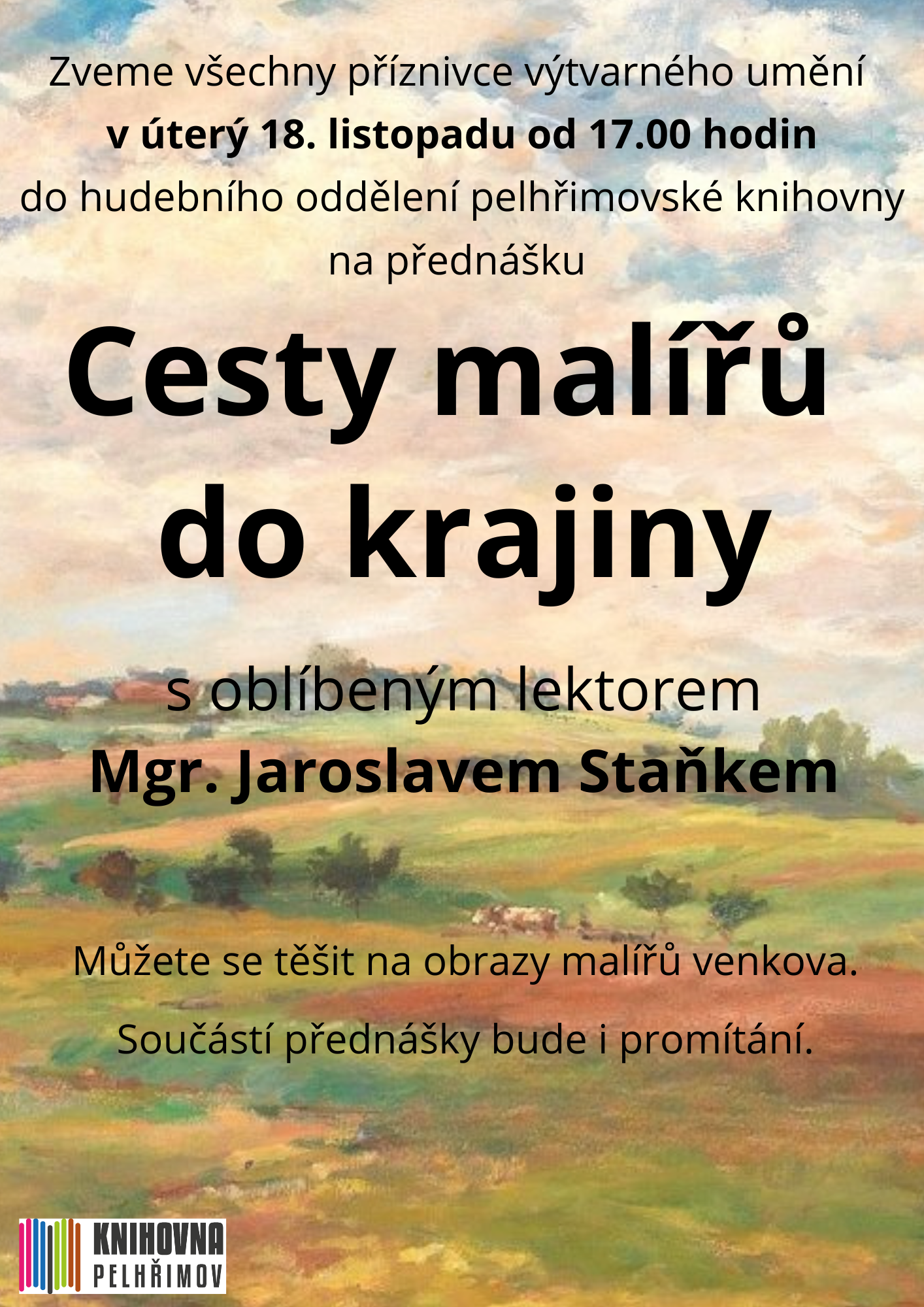 Zveme všechny příznivce výtvarného umění v úterý 18. listopadu od 17.00 hodin do hudebního oddělení pelhřimovské knihovny na přednášku Cesty malířů do krajiny s oblíbeným lektorem Mgr. Jaroslavem Staňkem. Můžete se těšit na obrazy malířů venkova. Součástí přednášky bude promítání.