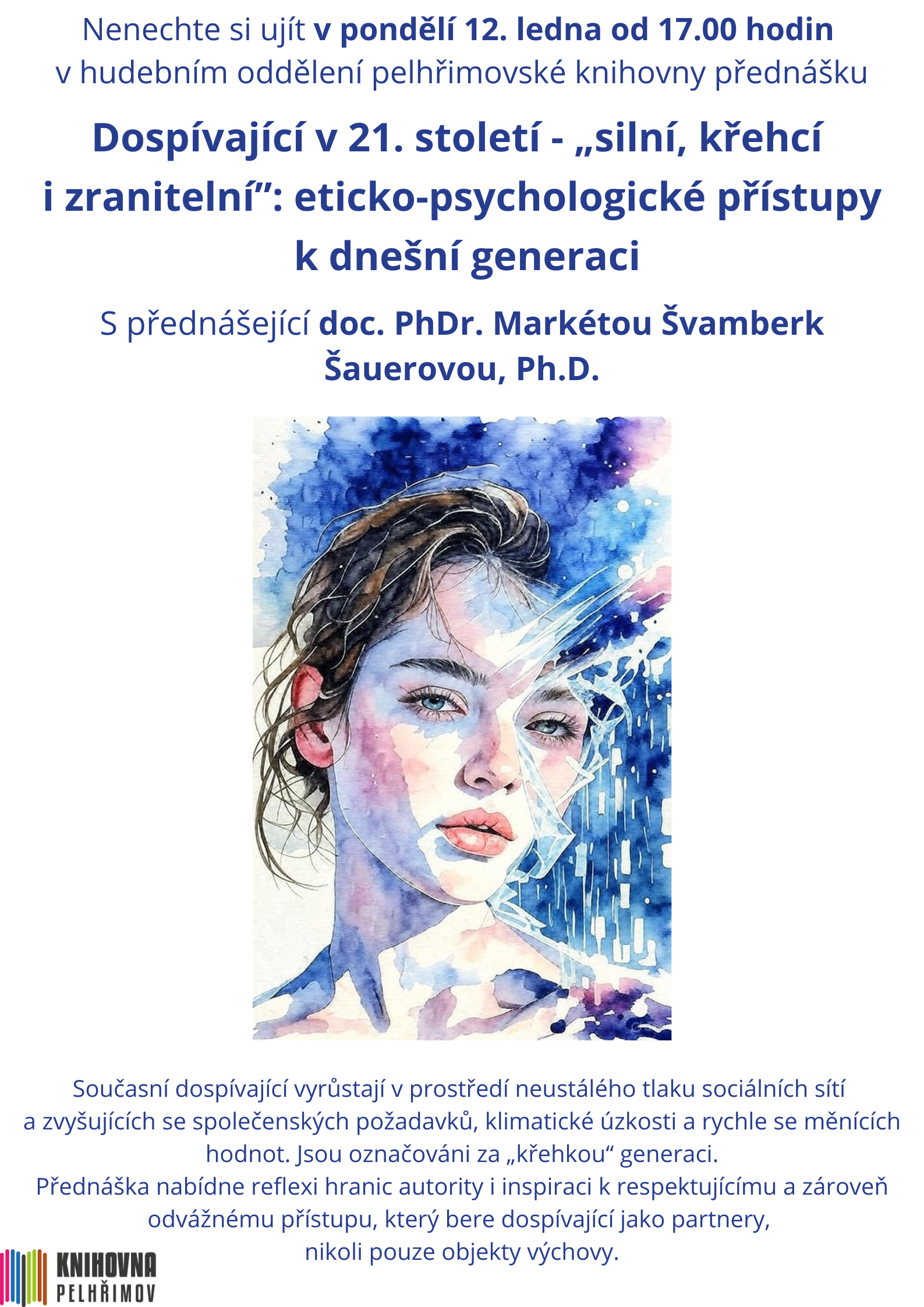 Nenechte si ujít v pondělí 12. ledna od 17.00 hodin v hudebním oddělení pelhřimovské knihovny přednášku Dospívající v 21. století – „silní, křehcí i zranitelní“: eticko-psychologické přístupy k dnešní generaci s přednášející doc. PhDr. Markétou Švamberk Šauerovou, Ph.D. Současní dospívající vyrůstají v prostředí neustálého tlaku sociálních sítí a zvyšujících se společenských požadavků, klimatické úzkosti a rychle se měnících hodnot. Jsou označováni za „křehkou“ generaci, zároveň však prokazují mimořádnou empatii, kreativitu a odvahu prosazovat změnu. Seminář se zaměřuje na etické otázky, které přináší péče o tuto generaci: Jak najít rovnováhu mezi ochranou před riziky a podporou samostatnosti? Máme právo omezovat jejich digitální svobodu „pro jejich dobro“? Jak reagovat na projevy duševní zranitelnosti, aniž bychom je patologizovali? A jak vychovávat k odolnosti, když sami dospělí často nevíme, co je v tomto světě „normální“? Přednáška nabídne reflexi hranic autority i inspiraci k respektujícímu a zároveň odvážnému přístupu, který bere dospívající jako partnery, nikoli pouze objekty výchovy.