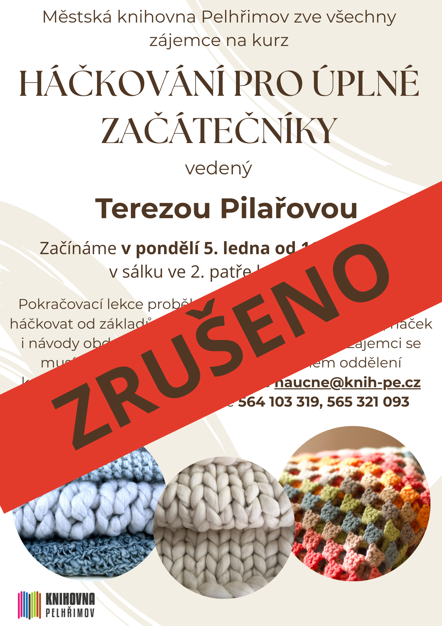 Háčkování pro úplné začátečníky - leden 2026 - ZRUŠENO 05.01.2026 16:00 Kurz Háčkování pro úplné začátečníky vedený Terezou Pilařovou je ZRUŠEN.