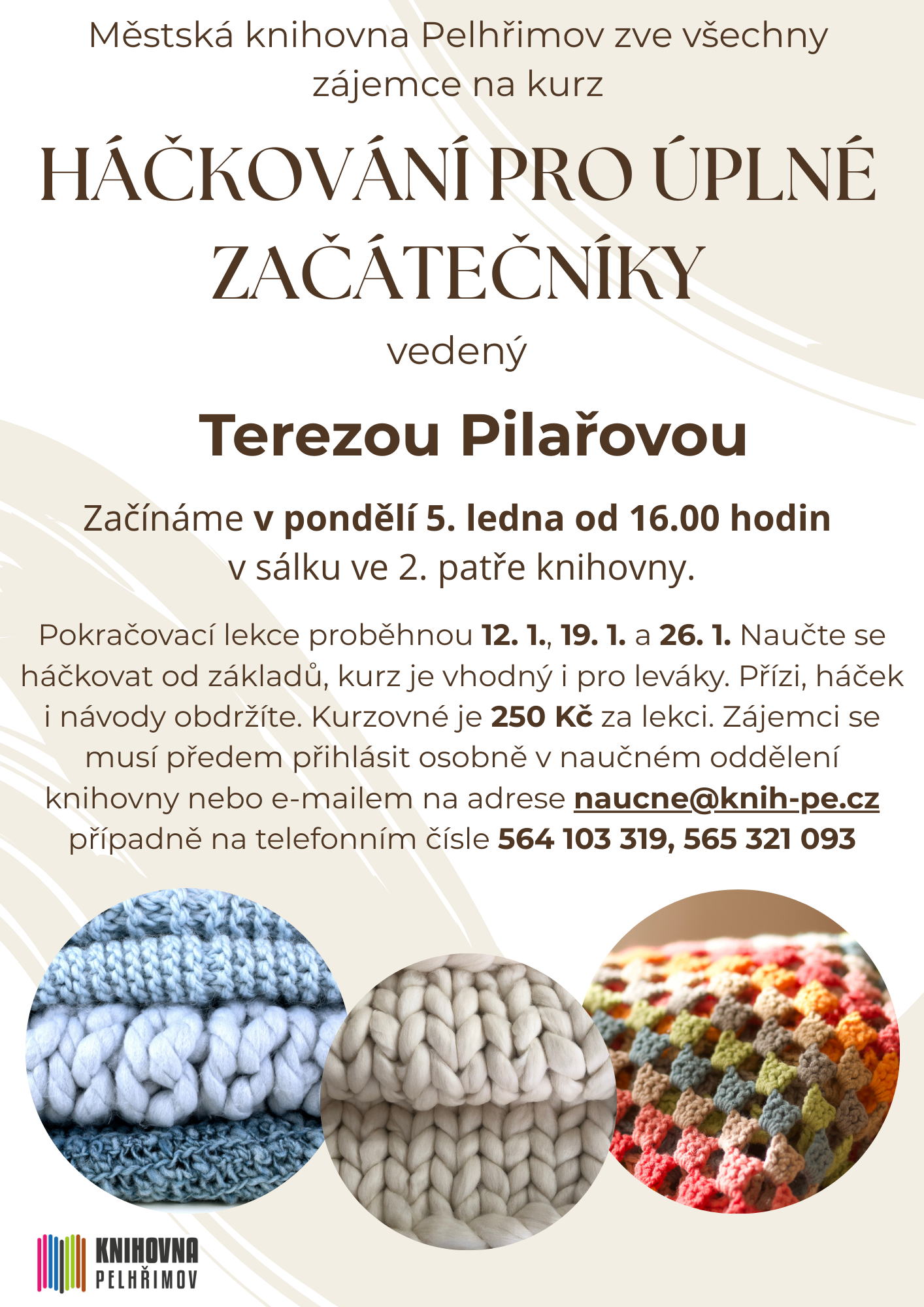Městská knihovna Pelhřimov zve všechny zájemce na kurz Háčkování pro úplné začátečníky vedený Terezou Pilařovou, začínáme v pondělí 5. ledna od 16.00 hodin v sálku ve 2. patře knihovny. Pokračovací lekce proběhnou 12. 1., 19. 11. a 26.1. Naučte se háčkovat od základů, kurz je vhodný i pro leváky. Přízi, háček i návody obdržíte. Kurzovné je 250 Kč za lekci. Zájemci se musí předem přihlásit osobně v naučném oddělení knihovny nebo e-mailem na adrese naucne@knih-pe.cz případně na telefonním čísle 564 103 319, 565 321 093.