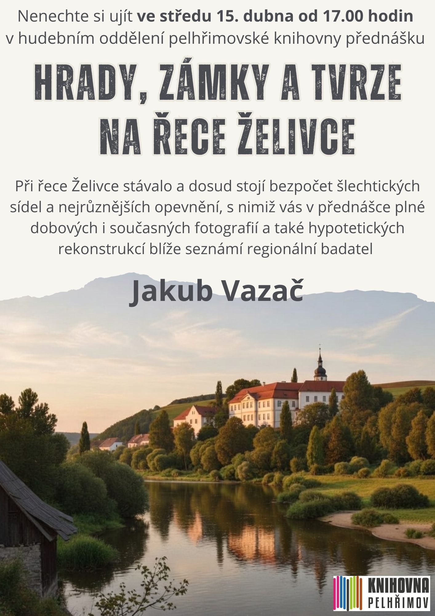 Nenechte si ujít ve středu 15. dubna od 17.00 hodin v hudebním oddělení pelhřimovské knihovny přednášku Hrady, zámky a tvrze na řece Želivce. Při řece Želivce stávalo a dosud stojí bezpočet šlechtických sídel a nejrůznějších opevnění, s nimiž vás v přednášce plné dobových i současných fotografií a také hypotetických rekonstrukcí blíže seznámí regionální badatel Jakub Vazač.