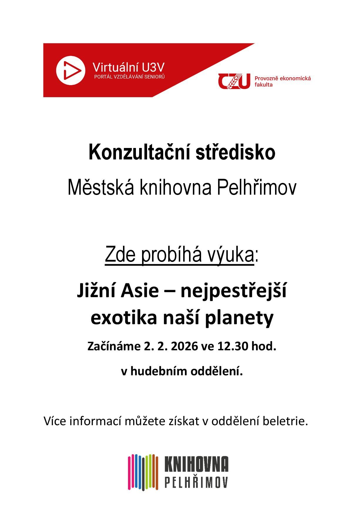 Městská knihovna Pelhřimov nabízí studium Virtuální univerzity třetího věku (VU3V), které připravila Česká zemědělská univerzita v Praze a pelhřimovská knihovna se stala jedním z jejích konzultačních středisek. Další semestr bude začínat vybraným kurzem Jižní Asie – nejpestřejší exotika naší planety v pondělí 2. února od 12.30 hodin v hudebním oddělení. Zájemci o studium mohou přijít na tuto úvodní přednášku nebo se přihlásit předem na e-mail: vedouci@knih-pe.cz nebo telefon: 776 012 355, vyplnit přihlášku ke studiu, kterou zájemce v knihovně dostane a uhradit studijní poplatek 400 Kč za daný kurz.