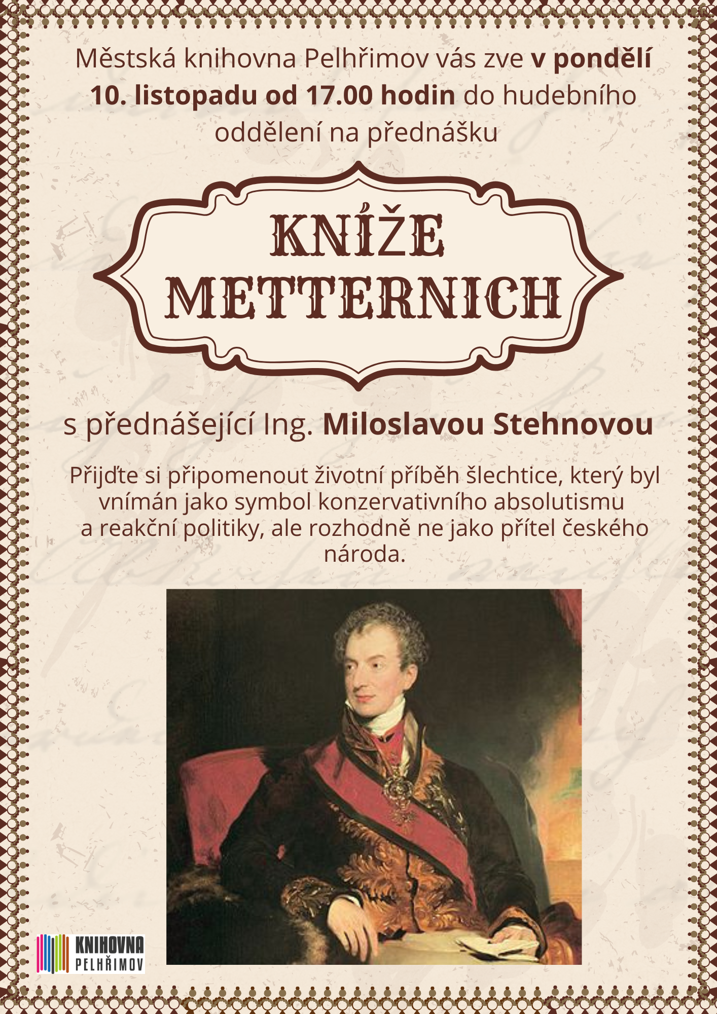 Městská knihovna Pelhřimov vás zve v pondělí 10. listopadu od 17.00 hodin do hudebního oddělení na přednášku Kníže Metternich s přednášející Ing. Miloslavou Stehnovou. Přijďte si připomenout životní příběh šlechtice, který byl vnímán jako symbol konzervativního absolutismu a reakční politiky, ale rozhodně ne jako přítel českého národa. Jaký ale byl skutečný Metternich, císařský kancléř, který byl ve funkci dlouhých 27 let? Někteří historici ho považují za umírněného reformátora, ochránce českého jazyka i kultury, a především za muže budujícího systém mezistátních vztahů založený na respektování mezinárodního práva. Podle nich byl ochráncem rovnoprávnosti národů a nechtěl germanizovat Čechy.