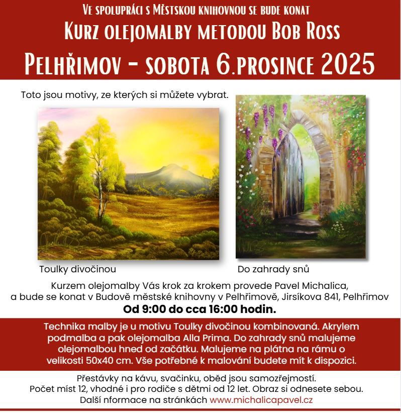 Pavel Michalica ve spolupráci s Městskou knihovnou Pelhřimov pořádá v sobotu 6. prosince 2025 od 9.00 hodin v knihovně Kurz olejomalby metodou Bob Ross. Kurzem Vás krok za krokem provede Pavel Michalica, certifikovaný instruktor metody Bob Ross. Na výběr máte ze dvou motivů. Českou krajinku nebo Modré dveře. Budeme malovat olejomalbou Alla Prima – mokrá do mokré, na plátno o velikosti 50x40 cm. Přestávky na kávu, svačinku, oběd jsou samozřejmostí. Počet míst 12, vhodné i pro rodiče s dětmi od 12 let. Na kurzu, budete mít vše potřebné k dispozici. Obraz si odnesete s sebou. Více informací se dozvíte na stránkách www.michalicapavel.cz Plná cena kurzu je 1950 Kč za osobu. Využijte možnost vzít s sebou svého blízkého a můžete mít kurz levnější. Přijďte ve dvou a kurz máte za 1850 Kč na osobu. Je vás více? Vyjdu Vám vstříc a bude to ještě výhodnější. Tři až deset osob v jedné skupině (rodina, přátelé) – kurz za 1800 Kč – za osobu. Platbu za kurz přijímáme předem platbou na účet 88277388/2010. Buď v celé výši, nebo zálohu 1000 Kč. Variabilní symbol platby: 932024 a do zprávy: Příjmení a tel.číslo. Rezervace na telefonu 605 355 527, případně zaslat SMS ve tvaru: Jméno a příjmení, Váš e-mail, datum kurzu a motiv, co budete malovat (pokud máte již vybráno) nebo e-mailem na: pavelmichalica@seznam.cz