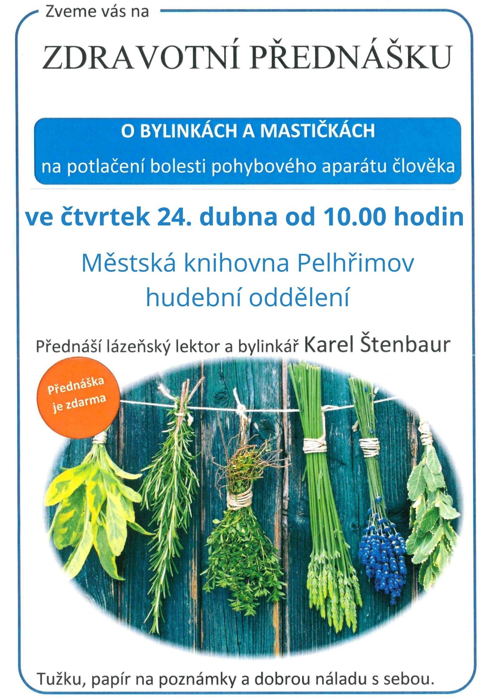 Městská knihovna Pelhřimov zve ve čtvrtek 24. dubna od 10.00 hodin do hudebního oddělení na zdravotní přednášku O bylinkách a mastičkách na potlačení bolesti pohybového aparátu člověka. Přednáší lázeňský lektor a bylinkář Karel Štenbaur. Tužku, papír na poznámky a dobrou náladu s sebou…