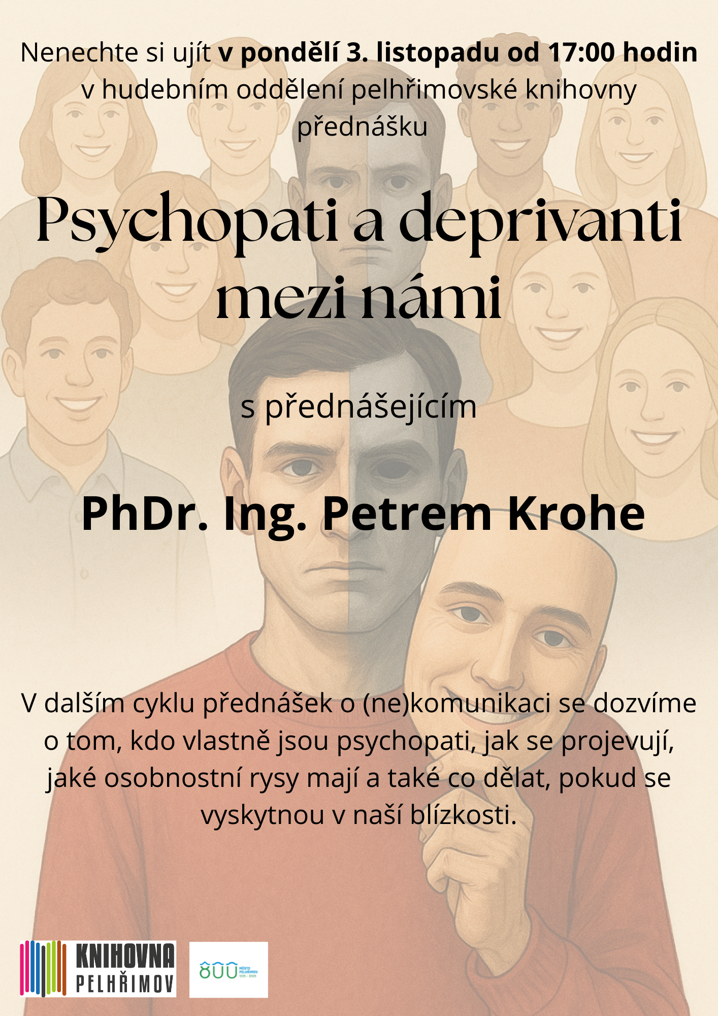 Nenechte si ujít v pondělí 3. listopadu od 17.00 hodin v hudebním oddělení pelhřimovské knihovny přednášku Psychopati a deprivanti mezi námi s přednášejícím PhDr. Ing. Petrem Krohe. V dalším cyklu přednášek o (ne)komunikaci se dozvíme o tom, kdo vlastně jsou psychopati, jak se projevují, jaké osobnostní rysy mají a také co dělat, pokud se vyskytnou v naší blízkosti.