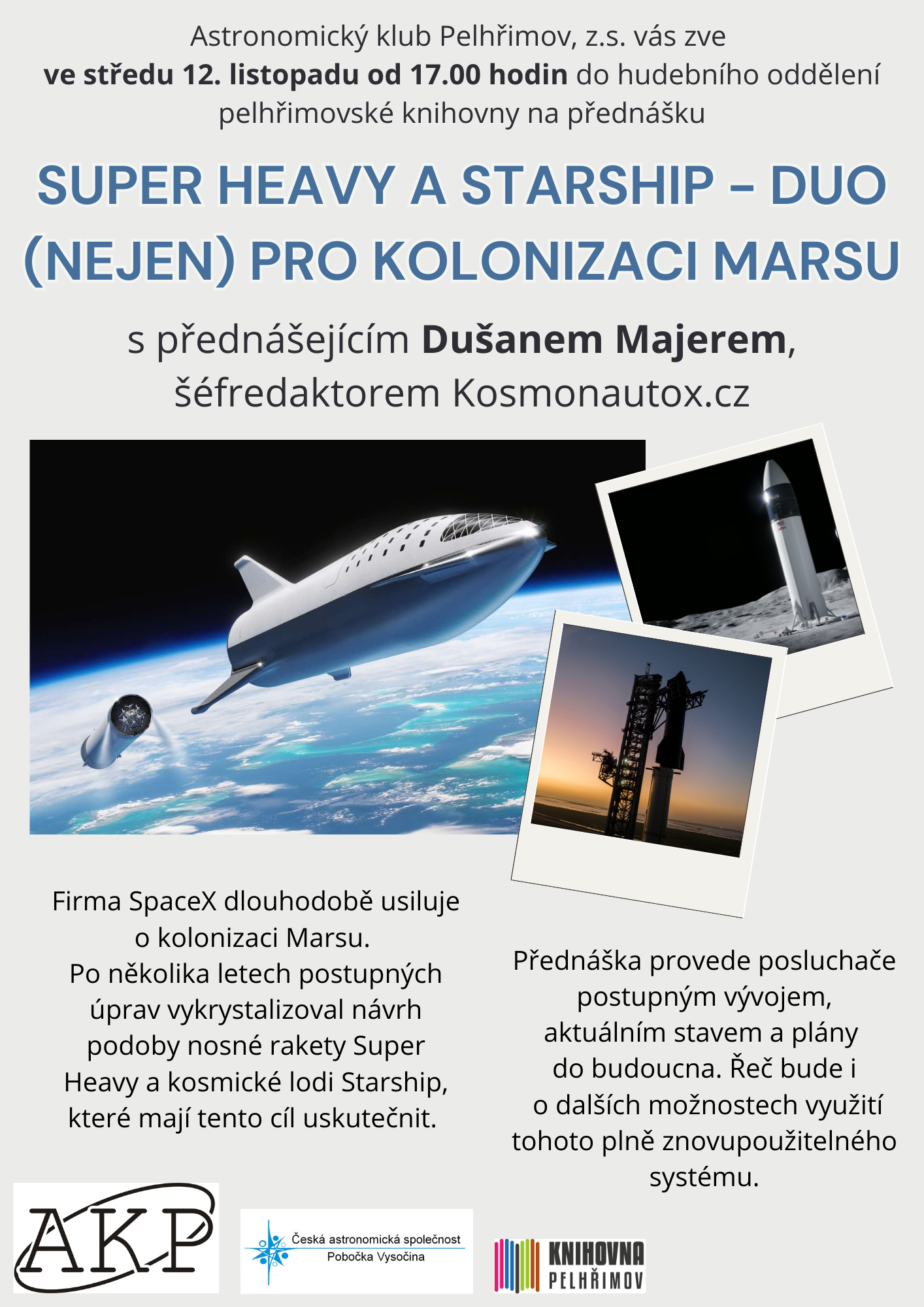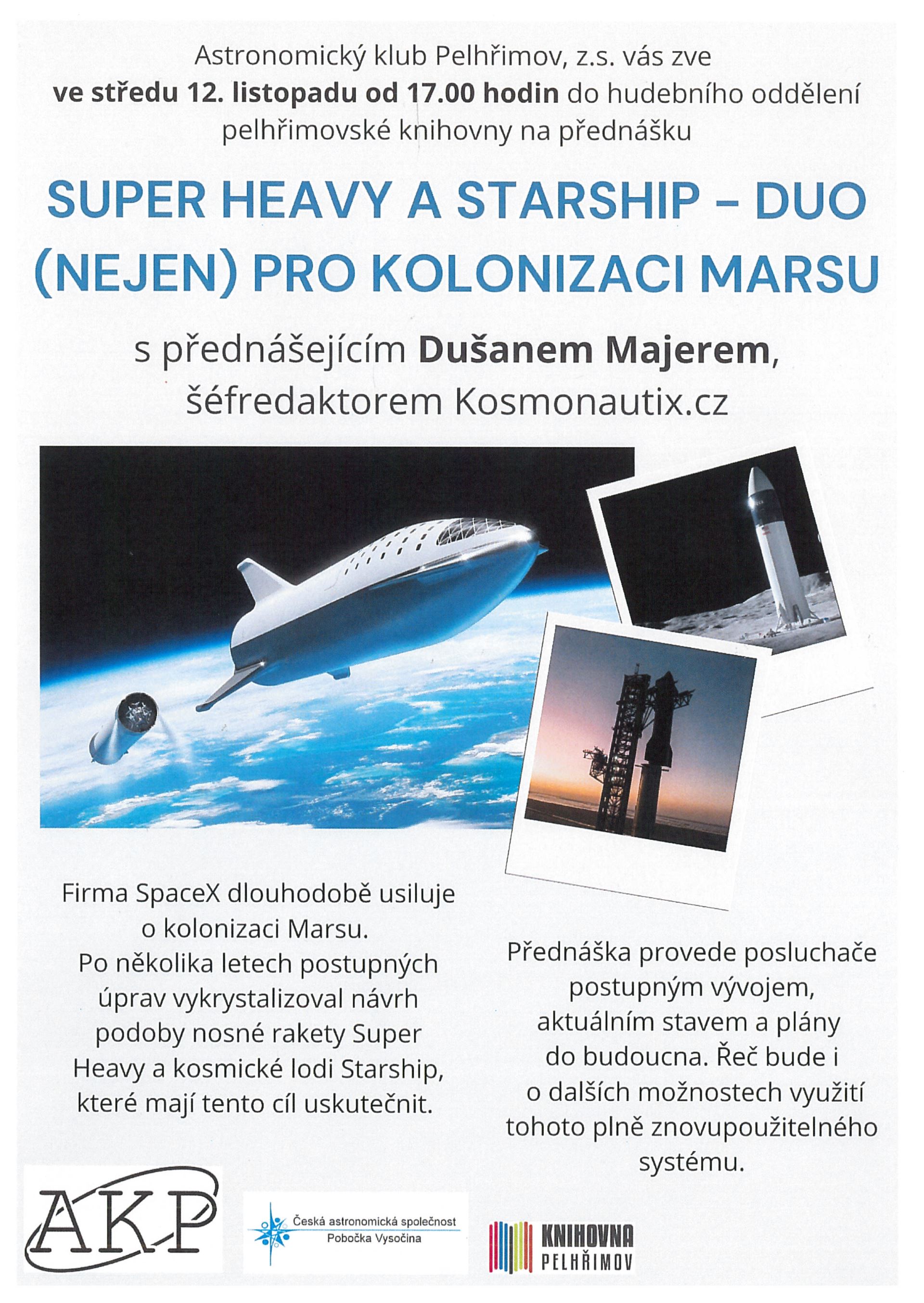 Astronomický klub Pelhřimov, z.s. vás zve ve středu 12. listopadu od 17.00 hodin do hudebního oddělení pelhřimovské knihovny na přednášku Super heavy a Starship – duo (nejen) pro kolonizaci Marsu s přednášejícím Dušanem Majerem, šéfredaktorem Kosmonautix.cz Firma SpaceX dlouhodobě usiluje o kolonizaci Marsu. Po několika letech postupných úprav vykrystalizoval návrh podoby nosné rakety Super Heavy a kosmické lodi Starship, které mají tento cíl uskutečnit. Cesta to sice bude ještě dlouhá a těžká, ale první testovací prototypy se už staví a v nejbližších letech se máme rozhodně na co těšit. Přednáška provede posluchače postupným vývojem, aktuálním stavem a plány do budoucna. Řeč bude i o dalších možnostech využití tohoto plně znovupoužitelného systému.