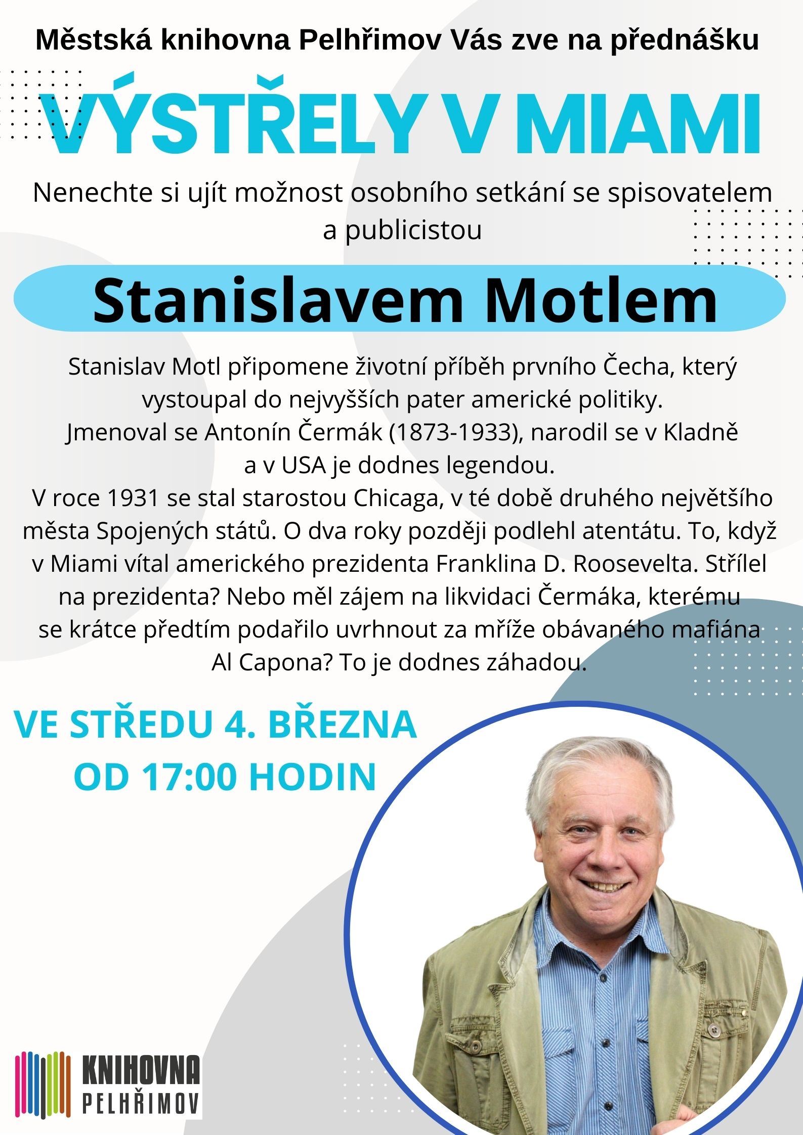 Nenechte si ujít ve středu 4. března od 17.00 hodin v hudebním oddělení pelhřimovské knihovny možnost osobního setkání se spisovatelem a publicistou Stanislavem Motlem. Jeho přednáška Výstřely v Miami (Příběh českého starosty Chicaga Antonína Čermáka) připomene životní příběh prvního Čecha, který vystoupal do nejvyšších pater americké politiky. Jmenoval se Antonín Čermák (1873-1933), narodil se v Kladně a v USA je dodnes legendou. Muž, který byl ztělesněním energie a síly. Původně chudý přistěhovalec, jenž od svých jedenácti let musel tvrdě pracovat na šachtě, aby měl vůbec co jíst. Člověk mimořádné vůle, který dokázal po nocích vystudovat a obstát v dravém podnikatelském světě. Aby si splnil svůj americký sen…V roce 1931 se stal starostou Chicaga, v té době druhého největšího města Spojených států. O dva roky později podlehl atentátu. To, když v Miami vítal amerického prezidenta Franklina D. Roosevelta. Střelcem byl italský přistěhovalec Giuseppe Zangara. Střílel na prezidenta? Nebo měl zájem na likvidaci Čermáka, kterému se krátce předtím podařilo uvrhnout za mříže obávaného mafiána Al Capona? To je dodnes záhadou. Reportér, spisovatel a filmový dokumentarista S. Motl (autor scénáře filmu) měl ojedinělou možnost, vydat se v USA po Čermákových stopách. Objevoval vzácné dokumenty, výpovědi pamětníků či jejich potomků. S pomocí policejních spisů se rovněž pokusil alespoň částečně objasnit také okolnosti atentátu. Výsledkem je 55minutový dokumentární film plný jedinečných vzpomínek a obrazových dokumentů.
