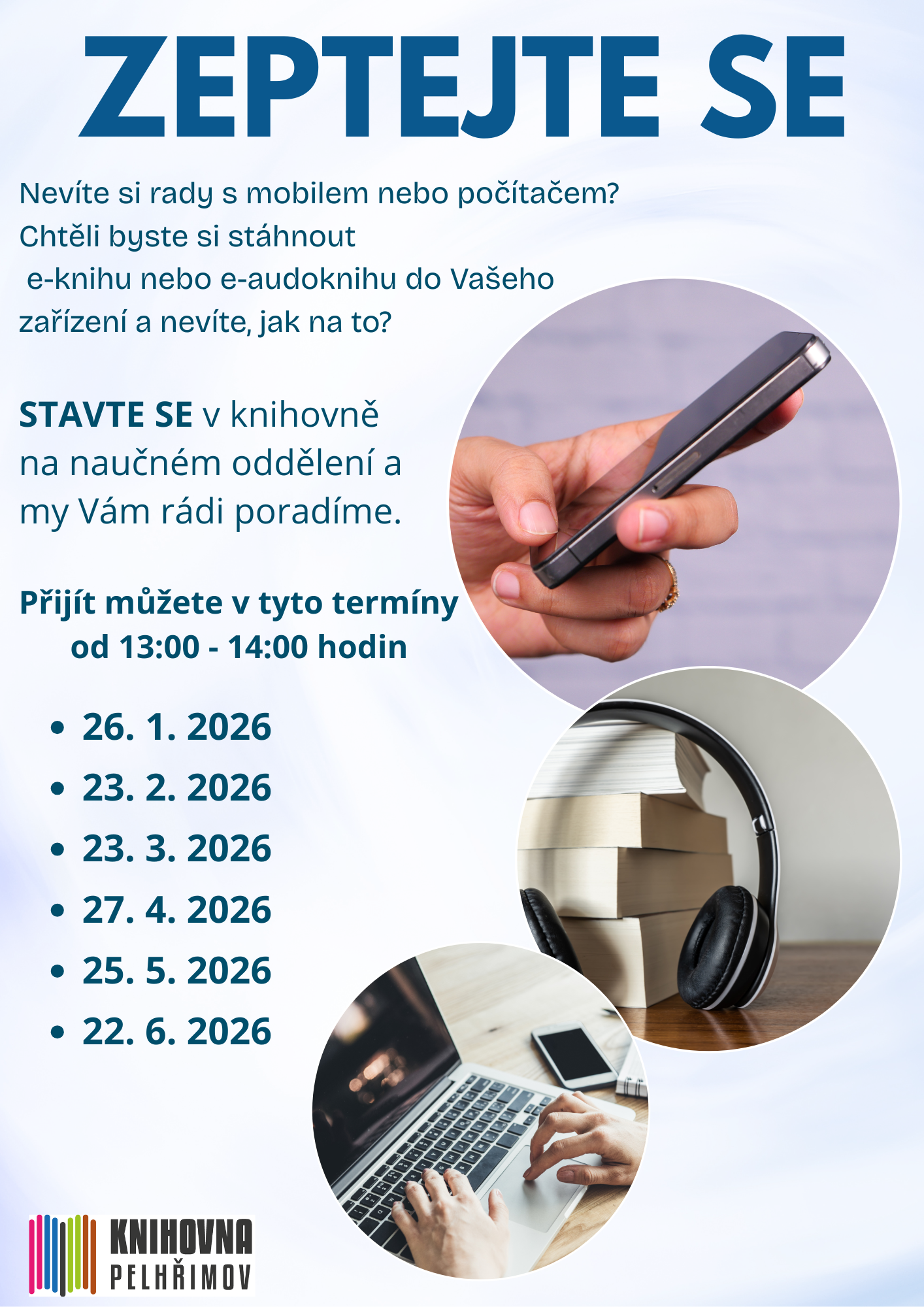 Nevíte si rady s mobilem nebo počítačem? Chtěli byste si stáhnout e-knihu nebo e-audoknihu do Vašeho zařízení a nevíte, jak na to? Vyzkoušejte novou službu pelhřimovské knihovny Zeptejte se. Jednou měsíčně vám knihovníci v naučném oddělení v 1. patře rádi pomohou vysvětlením i prakticky. Přijít můžete v tomto termínu: pondělí 23. února od 13.00 – 14.00 hodin. Naše digitální poradna se těší na Vaši návštěvu.