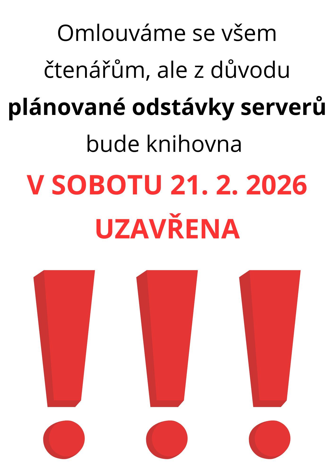 UPOZORNĚNÍ PRO ČTENÁŘE!!! 20.02.2026 Z důvodu plánované odstávky serverů bude knihovna v sobotu 21. 2. 2026 uzavřena